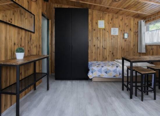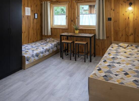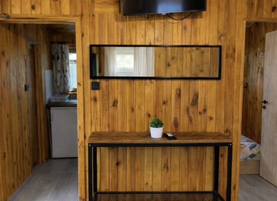 Ciechów to przytulny, drewniany domek idealny dla 3–4 osób – świetny wybór zarówno na rodzinny wypoczynek, jak i relaks z przyjaciółmi. W domku znajdują się dwa komfortowe pomieszczenia: - zamykana sypialnia z wygodnym łóżkiem małżeńskim i regałem - przestronny pokój dzienny połączony z aneksem kuchennym, wyposażony w dwa pojedyncze łóżka, szafę oraz stół z krzesłami.