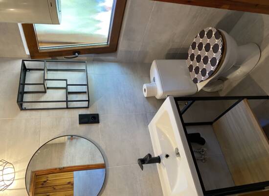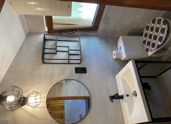 Do dyspozycji gości jest w pełni wyposażony aneks kuchenny, który umożliwia swobodne przygotowywanie posiłków: - lodówka - kuchenka elektryczna - czajnik elektryczny - garnki - naczynia - sztućce. Domek posiada również łazienkę z kabiną prysznicową oraz WC, a dla dodatkowego komfortu – telewizor z płaskim ekranem.
